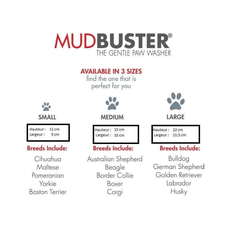 Le Mudbuster fonctionne bien pour la boue adhérant aux pattes des chiens après passage dans une zone humide, mais il s’avère aussi efficace pour les grains de sable restés entre les coussinets après une partie de plage.